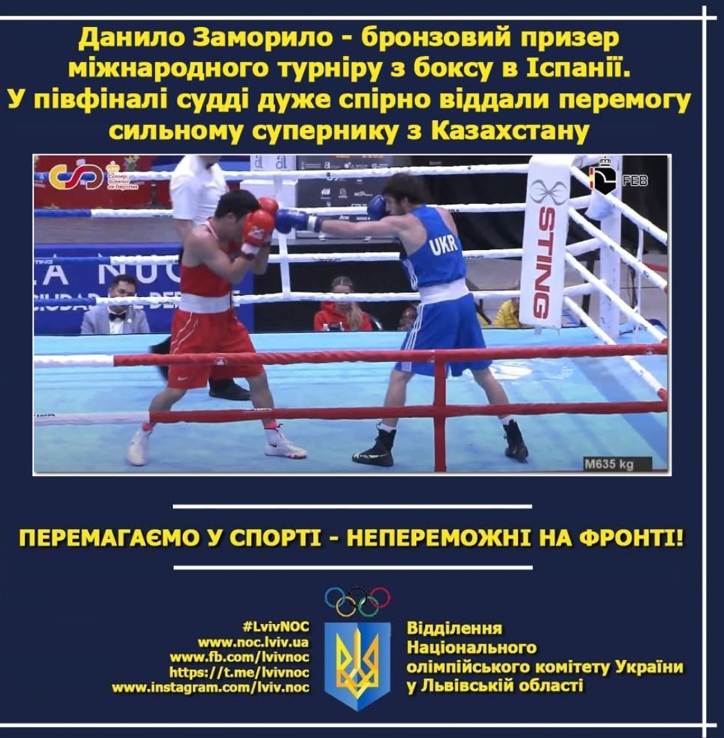 Львівський талант Данило Заморило (до 63,5 кг) 6 лютого дуже спірно, розділеним рішенням суддів поступився 30-річному боксерові з Казахстану Жандосу Кидиралієву у півфіналі Міжнародного турніру з боксу BOXAM International Tournament 2025 серед чоловіків і жінок (категорія Elite) в місті Ла-Нусія, Іспанія.