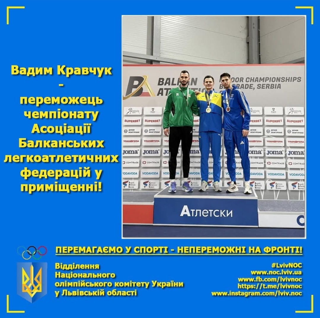 Вчора, 15 лютого, в Белграді, Сербія, відбувся чемпіонат Асоціації балканських легкоатлетичних федерацій (ABAF) з легкої атлетики серед дорослих у приміщенні. Переможцем змагання зі стрибків у висоту серед чоловіків став 28-річний представник Львівщини Вадим Кравчук.